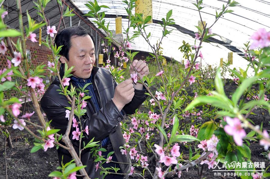 阿荣旗职业中专农业科技示范园区大棚内桃花竞相开放,农学班李正福老师正在给桃花授粉。据了解,温室桃树一边倒栽培技术是一个重点试验项目,该技术采用特殊的整形方法,使树体向一边倾斜,从而抑制树体顶端优势,促进枝条花芽分化,实现提早结果丰产,彻底打破了传统的“桃三杏四梨五年”的传统理论,实现“今年栽树,明年结果”的目标。